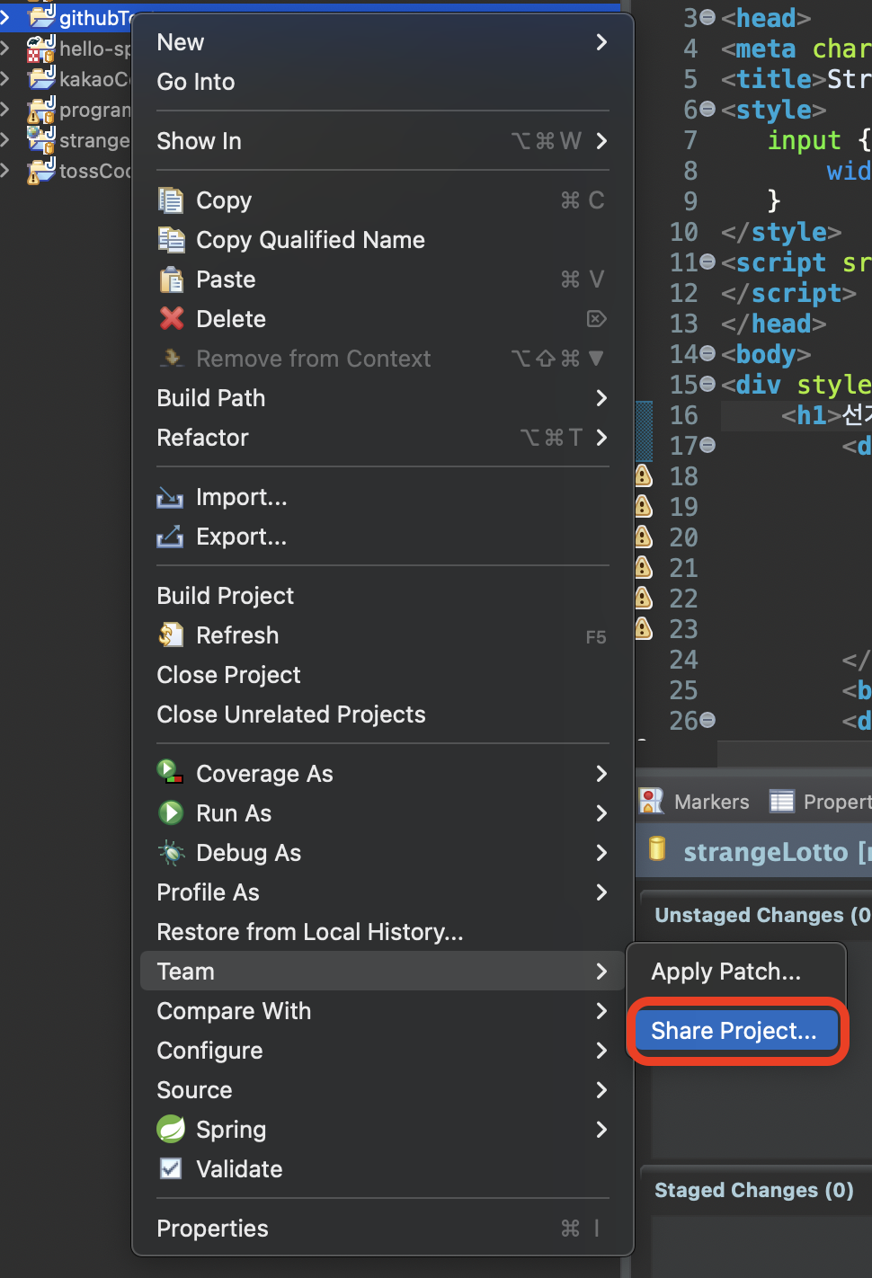 8) 이제 깃허브와 연동하고자 하는 프로젝트 마우스 우클릭