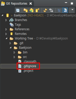 3) 다시 이클립스로 돌아와 [Git Repositories]에서 .giotignore를 클릭하여,