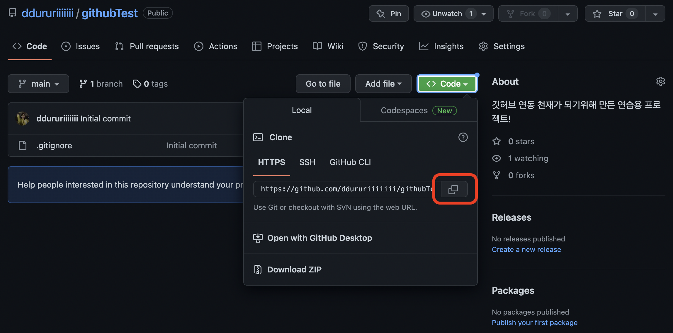 내 레파지토리와 비슷한 캡처화면의 빨간 부분을 복사해오면 됨.