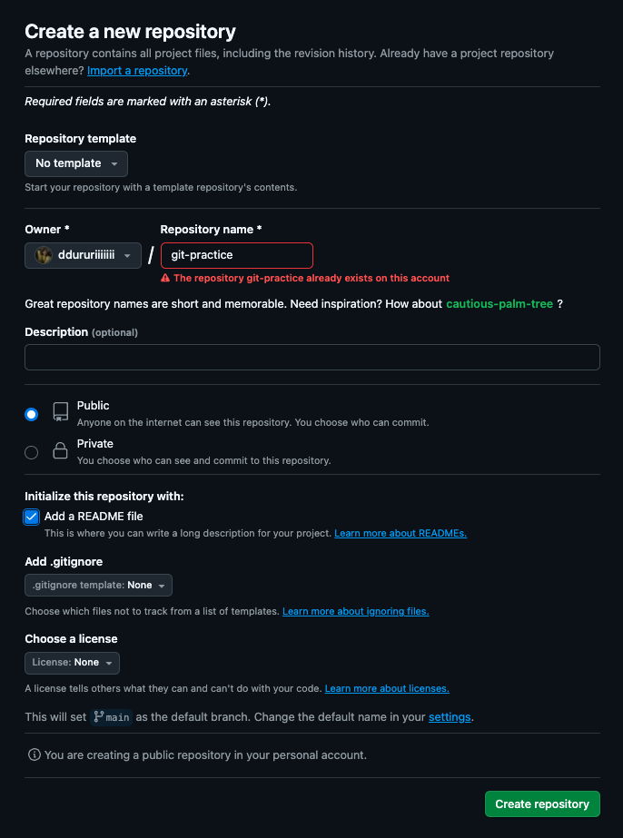 1) 내 깃허브에서 [Create a new repository] 해줌