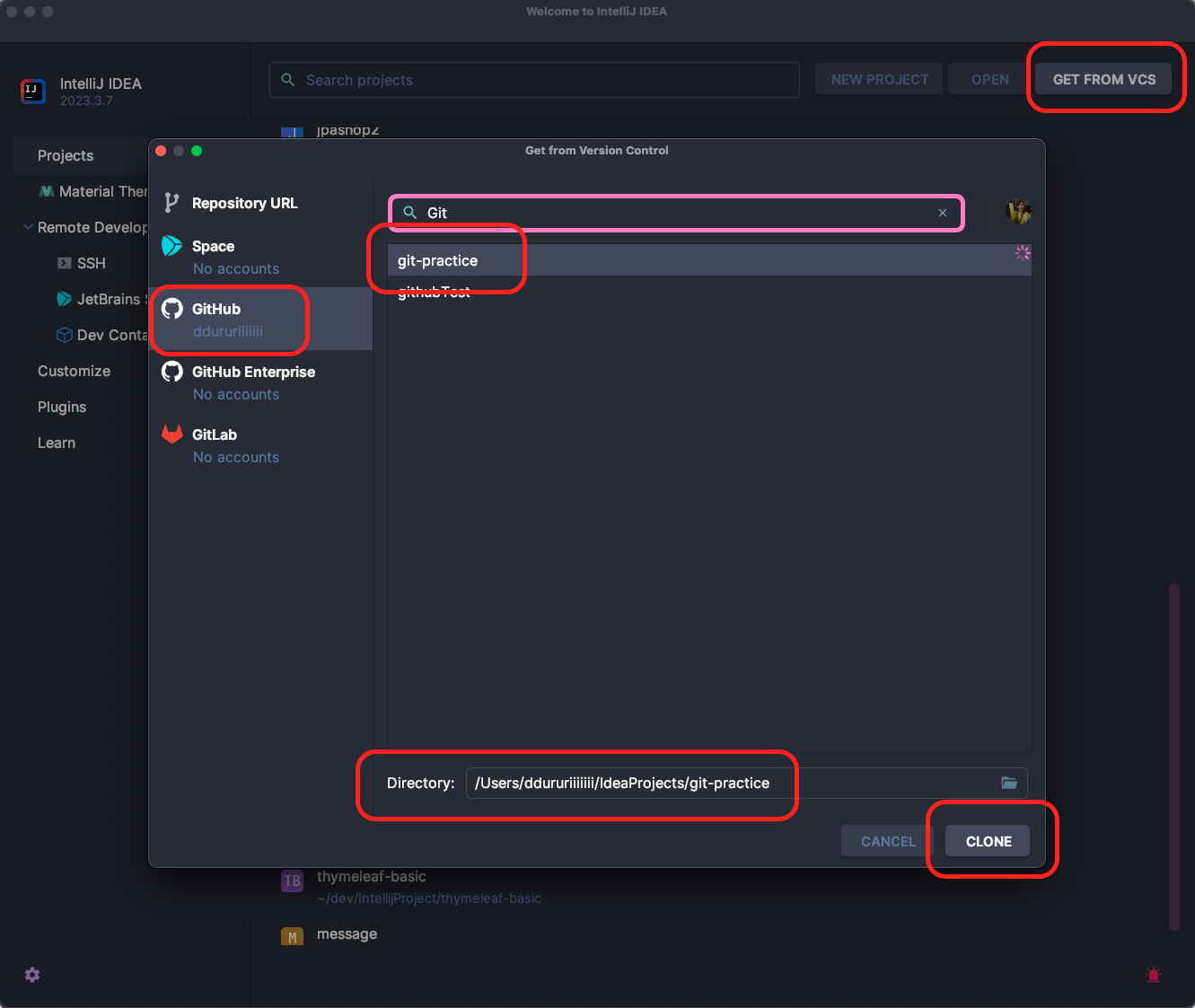 인텔리제이 켠 후 우측 상단 [GET FROM VCS] 클릭 - 좌측 [GitHub] 클릭 - 내가 만든 프로젝트 선택 후 프로젝트를 받아올 경로 확인 후 [CLONE] 해주면 받아와짐.