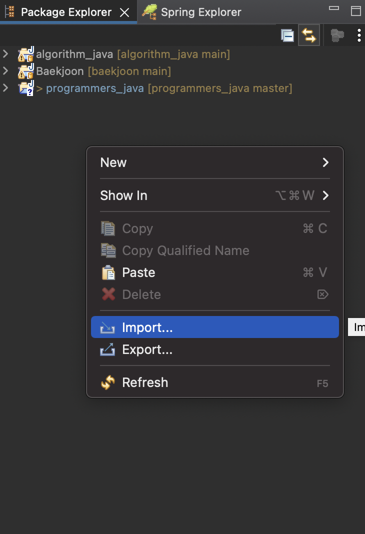5. [Package Explorer] 창 빈화면에서 오른쪽 버튼 클릭 - [Import] 클릭