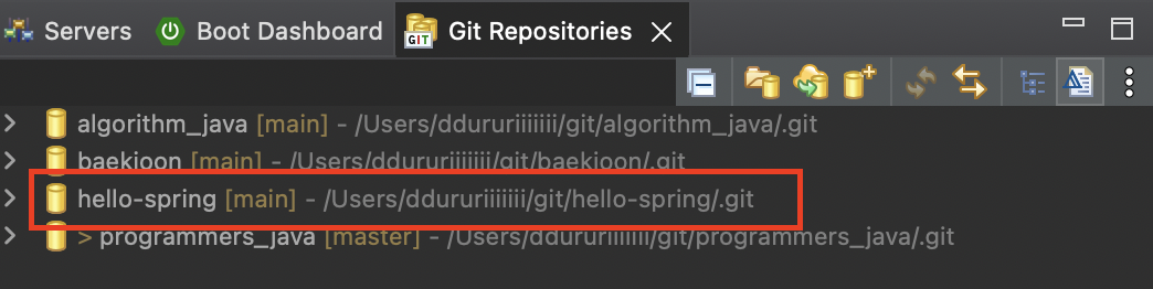 4. 완료 되면 [Git Repositories] 창에 해당 프로젝트가 생기게 된다.